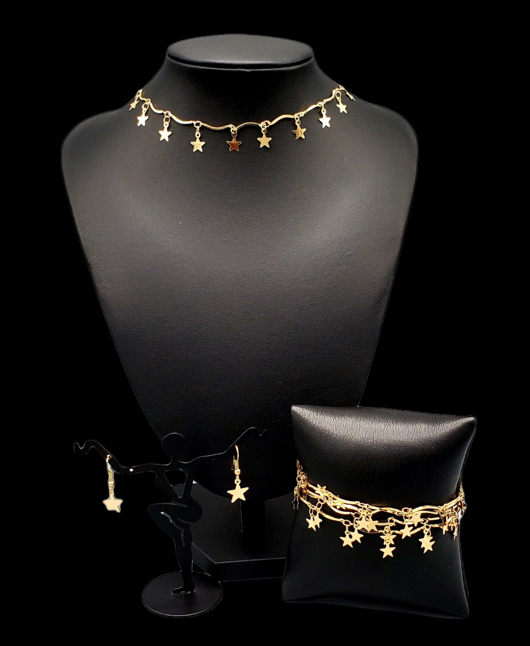 This glittery star jewelry set comes with a necklace and complimentary earrings, and TWO clasp bracelets.