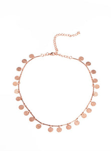 Necklace - "Musically Minimalist": Hammered shiny copper discs swing from interconnected shiny copper bars around the neck, creating a shimmery fringe. Features an adjustable clasp closure. Includes one pair of matching earrings.